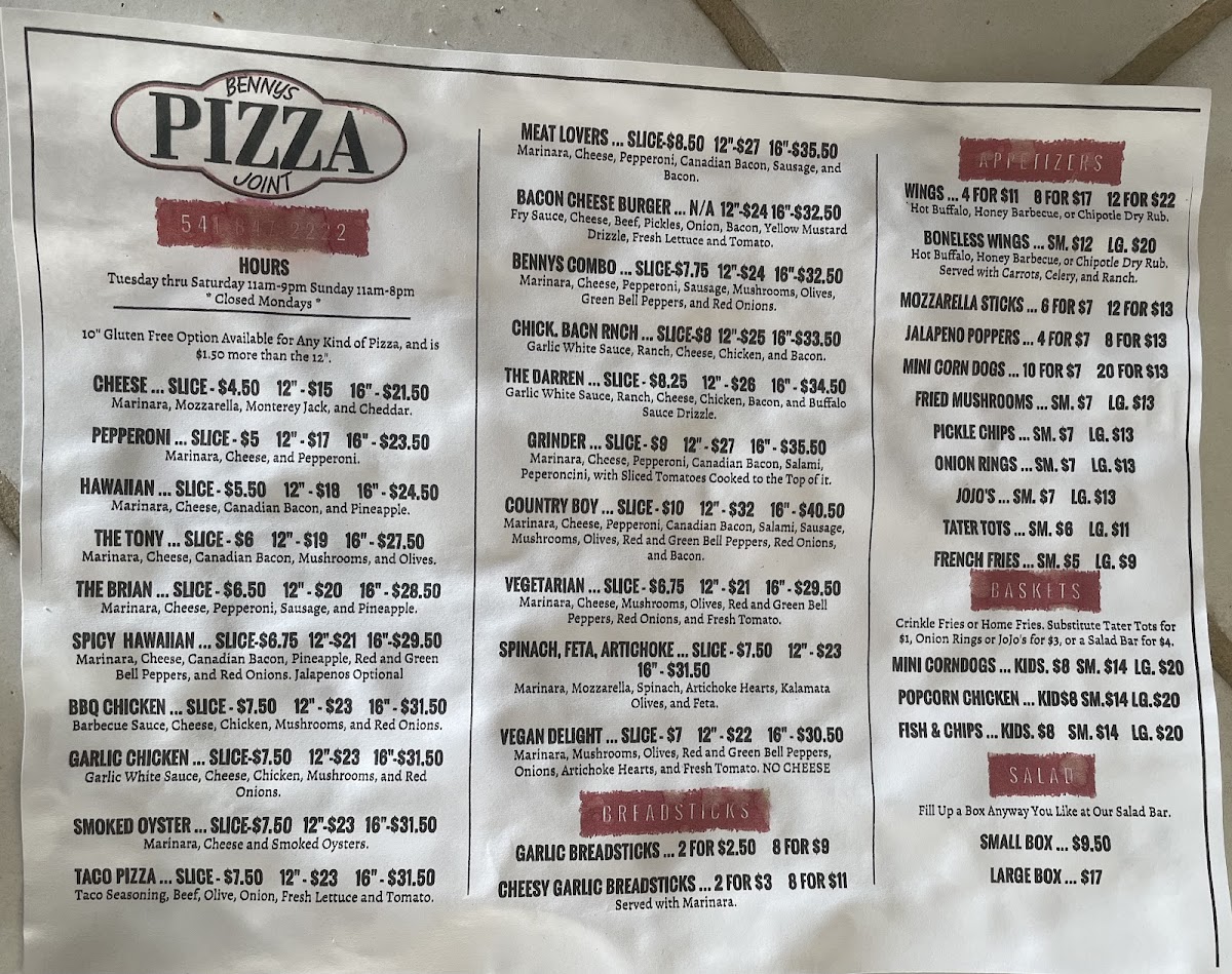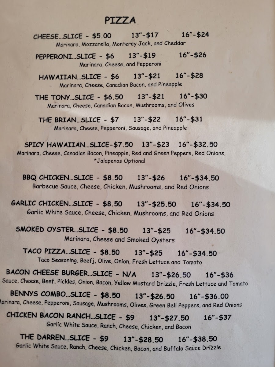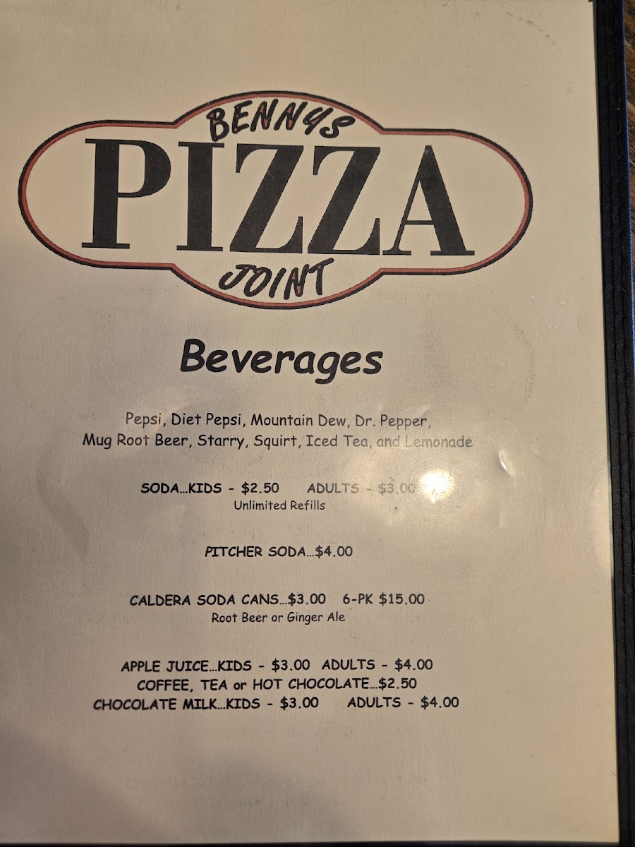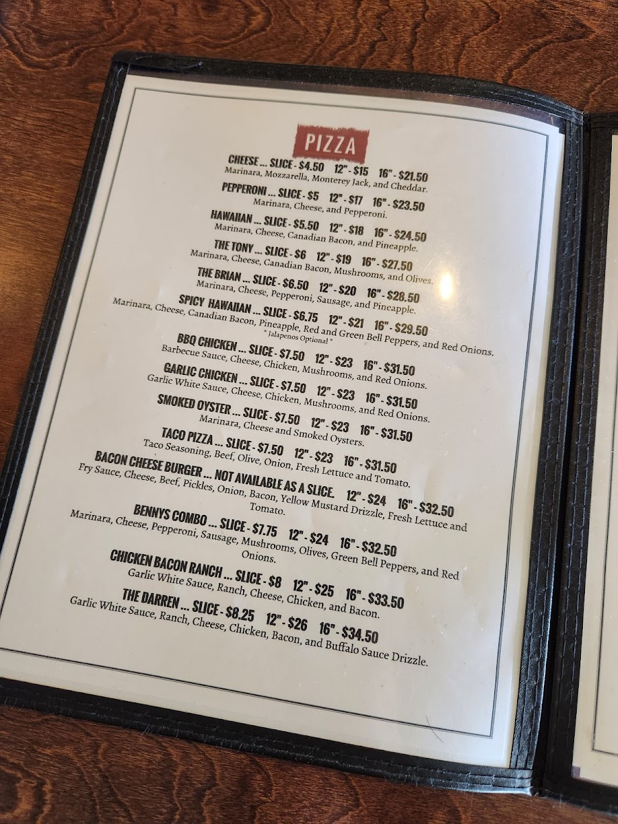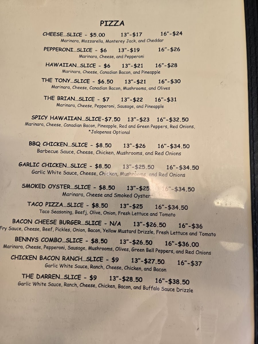 Bennys Pizza Joint Menu